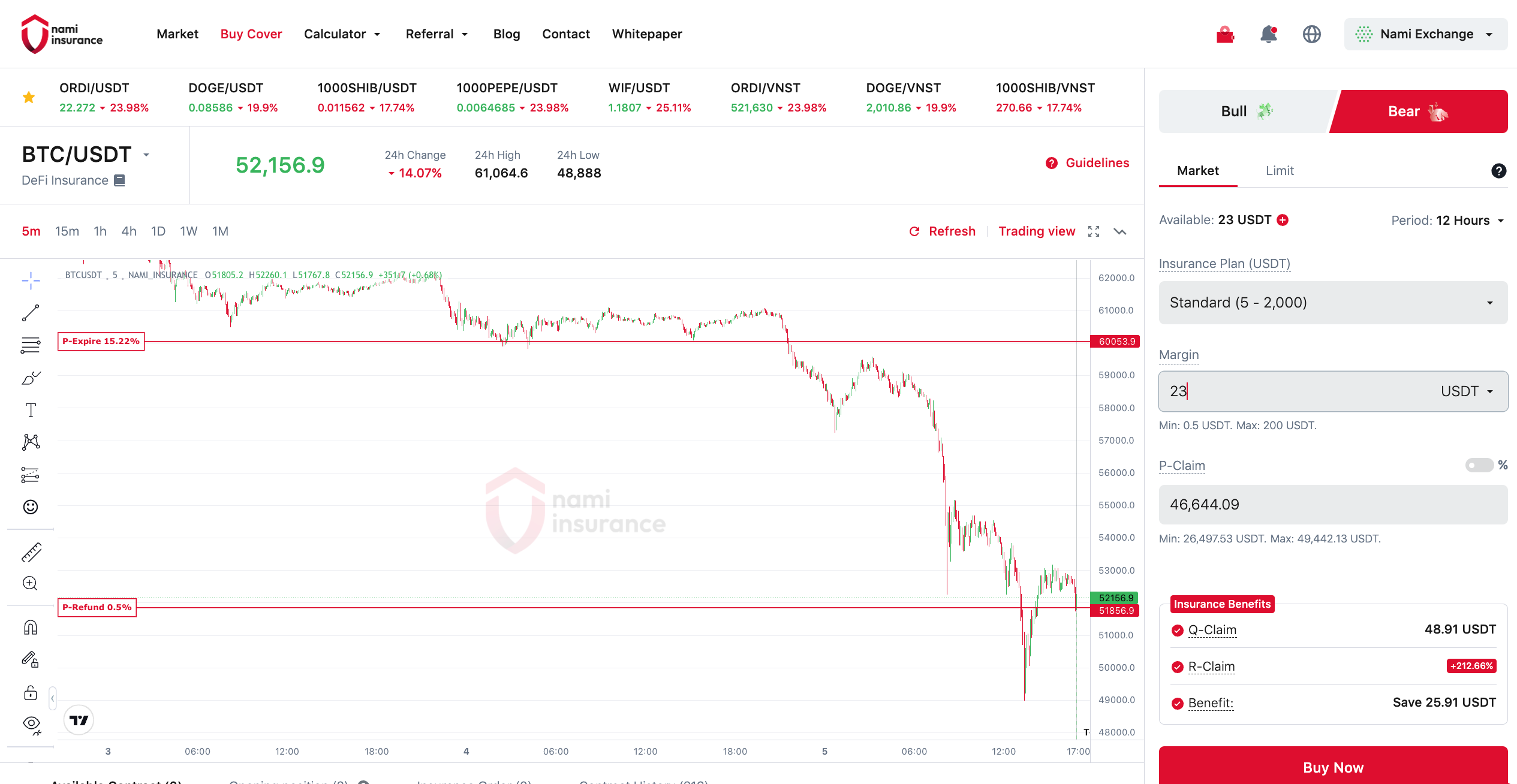 &#x20;The user needs to deposit 23 USDT to buy a Standard insurance plan (5-2,000 USDT) with a Bear expectation for the BTC/USDT asset pair, at a P-Open price of 52,156.9 with a validity period of 12 hours. In this case, the default P-Claim is 46,644.09, P-Expire is 60,053.9, and P-Refund is 51,856.9.